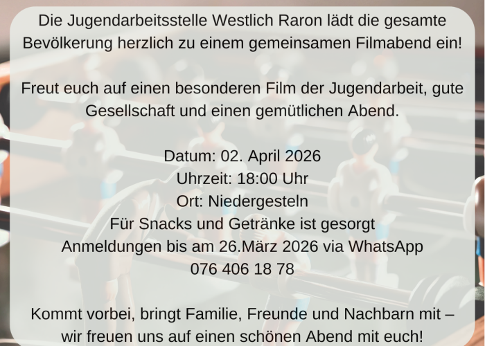 Die Jugendarbeitsstelle Westlich Raron lädt die gesamte Bevölkerung herzlich zu einem gemeinsamen Filmabend ein. Weitere Informationen entnehmen Sie bitte dem beigefügten Flyer.